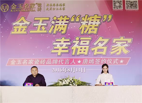 嘉華明星經(jīng)紀(jì)公司根據(jù)金玉名家陶瓷的企業(yè)文化及市場定位,在眾多明星當(dāng)中,金玉名家與嘉華明星經(jīng)紀(jì)公司一致認(rèn)為唐嫣是金玉名家代言人的不二人選,于8月14日,在北京JW萬豪酒店舉行金玉滿“糖” 幸福名家 金玉名家瓷磚品牌代言人唐嫣簽約儀式。我們相信,金玉名家與唐嫣的攜手合作,是金玉名家瓷磚品牌鑄就新篇章的開始,對于市場的開拓有極大的幫助,預(yù)祝金玉名家銷售長虹,唐嫣演藝事業(yè)蒸蒸日上。