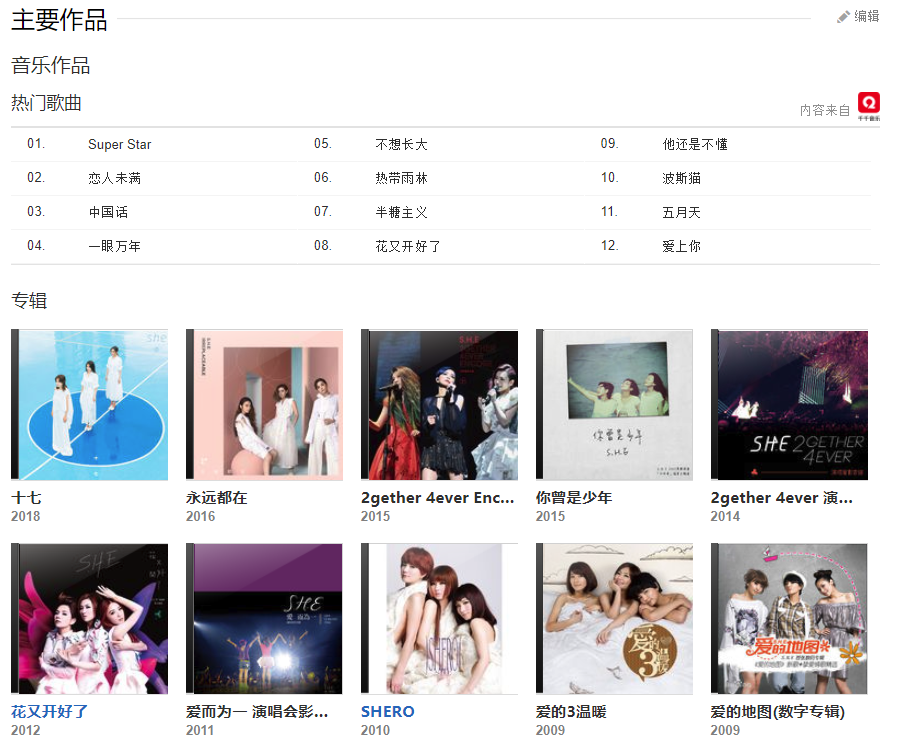 2000年共同參加《宇宙2000實(shí)力美少女爭(zhēng)霸戰(zhàn)》后受華研國(guó)際音樂相中并簽約。2001年9月11日發(fā)行首張專輯《女生宿舍》正式出道,憑借此專輯入圍第13屆臺(tái)灣金曲獎(jiǎng)最佳新人獎(jiǎng) 。2002年發(fā)行專輯《美麗新世界》并獲得第十四屆臺(tái)灣金曲獎(jiǎng)獲得最佳重唱組合獎(jiǎng)。2003年發(fā)行專輯《Super Star》入圍在第十五屆臺(tái)灣金曲獎(jiǎng)最佳重唱組合獎(jiǎng) 。2004年發(fā)行專輯《奇幻旅程》入圍第十六屆臺(tái)灣金曲獎(jiǎng)最佳重唱組合獎(jiǎng) ,同年舉行首場(chǎng)世界巡回演唱會(huì)。2005年發(fā)行專輯《不想長(zhǎng)大》入圍第十七屆臺(tái)灣金曲獎(jiǎng)入圍最佳重唱組合獎(jiǎng) [8] 。2006年舉辦《S.H.E移動(dòng)城堡世界巡回演唱會(huì)》。2007年發(fā)行專輯《Play》,憑借專輯主打曲《中國(guó)話》首次登上央視春晚表演。2008年發(fā)行專輯《我的電臺(tái)FMS.H.E》。2009年舉辦《S.H.E愛而為一世界巡回演唱會(huì)》;2010年發(fā)行專輯《SHERO》并宣布單飛不解散。2012年發(fā)行專輯《花又開好了》。2013年受中央電視臺(tái)春節(jié)聯(lián)歡晚會(huì)邀請(qǐng)并獻(xiàn)唱歌曲《SHERO》,3月舉辦巡回演唱會(huì)《2GETHER 4EVER 世界巡回演唱會(huì)》。2014年舉行《2GETHER 4EVER世界巡回演唱會(huì)安可場(chǎng)》 。2015年為內(nèi)地電影《少年班》獻(xiàn)唱主題曲《你曾是少年》。2016年8月推出EP《永遠(yuǎn)都在》。